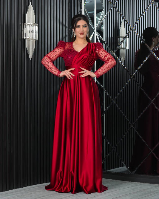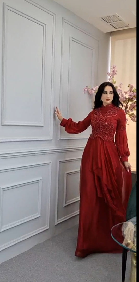 فستان احمر شيفون بكسرات مشغول