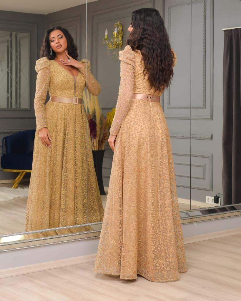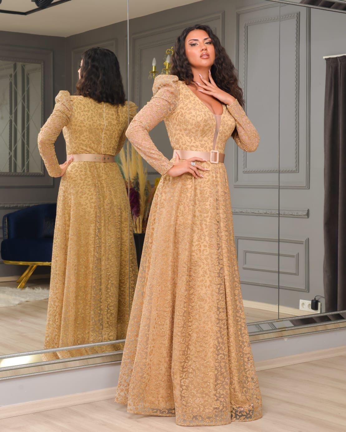 فستان طويل باكمام طويلة وحزام وقماش لامع لون راقي جدا