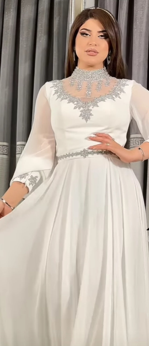 فستان سهرة ابيض شيفون مرصع بحجر كريستال