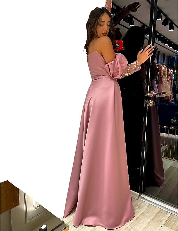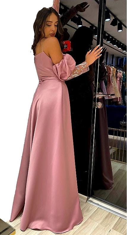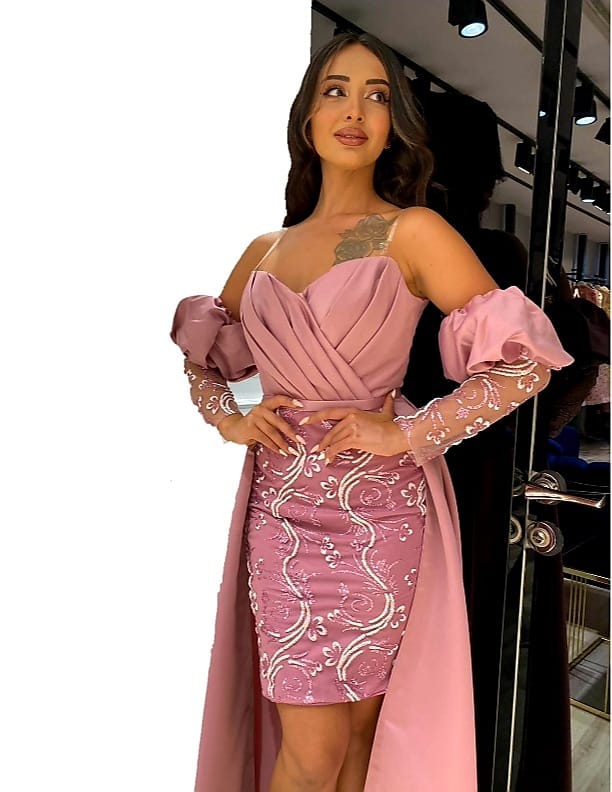 فستان سهرة قصير مع ذيل طويل واكمام مستقلة يمكن الاستغناء عنها مصنوع من قماش ستان فاي وقماش مشغول بالجليتر